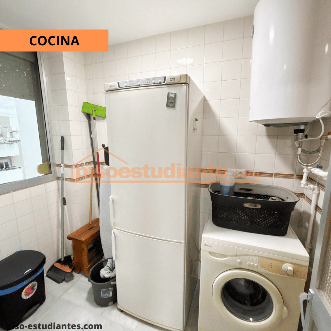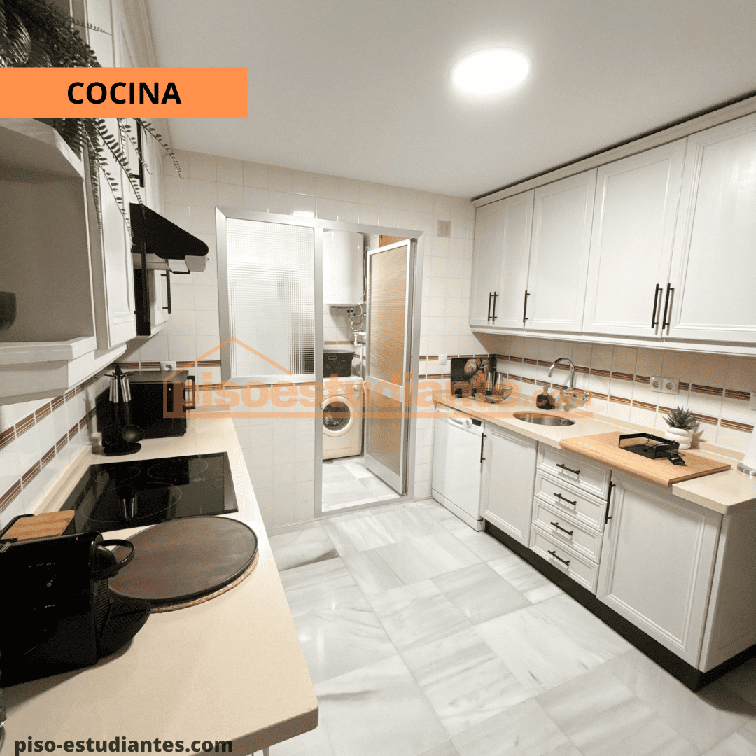 Con frigorífico, horno, lavadora, utensilios de cocina, cubiertos, vasos..